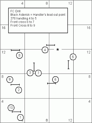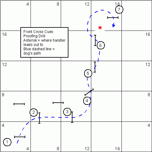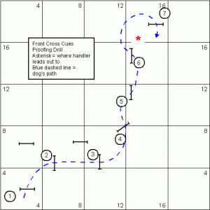 Ok onto the next part. Finishing off the Thursday night seminar Greg showed us a basic jumping sequence that illustrated one of the strongest proofs for testing your dog’s understanding of front cross cues. Below is the sequence; (Again don’t forget that all these diagrams below can be enlarged by clicking on them)