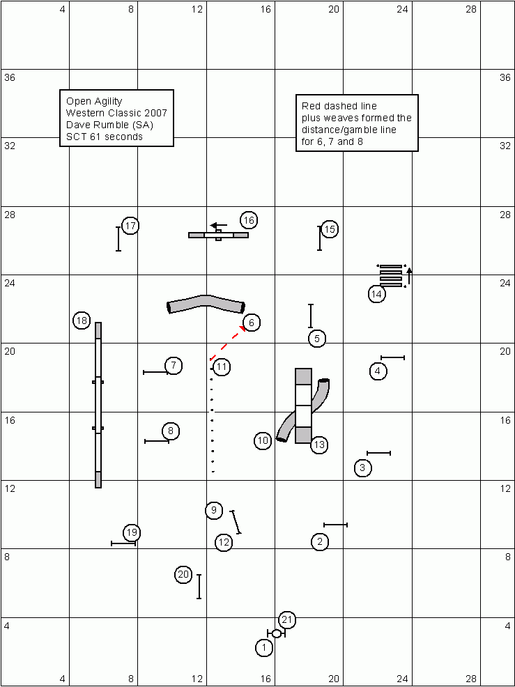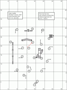 This course ran quite well, amazingly enough out of 42 dogs that ran it only 1 went clear! I had a badly timed bar come down when I ran Cypher (handler needed sock for mouth) and Raven…..well you’d have thought I did frequent blind cross moves on her because she copped a refusal at #3 due to heading straight for the a frame….weird!