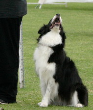 There is definitely something wrong with this photo – either Cy’s eye has just been caught by sexy female canine ringside OR he simply has not understood his SPIN command (go LEFT!)