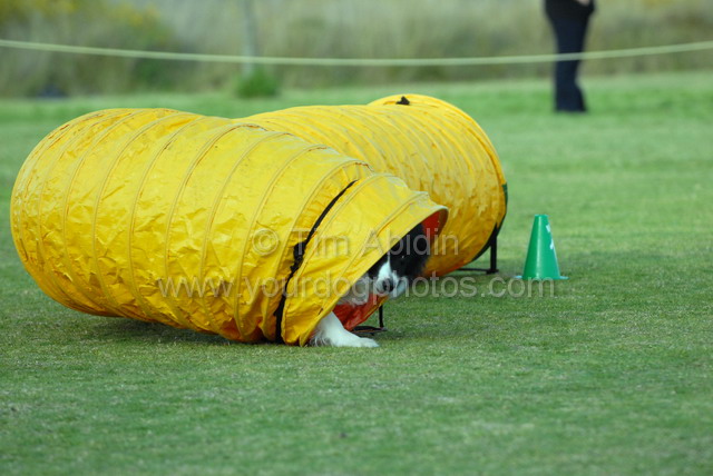 Agility was in the afternoon and Raven was third in order for Masters Jumping and decided that bars #2 and #3 could just be taken out. I stuffed Cy on this course moving off too early on a tunnel and he went in the wrong end. We then had Open Agility and Cy did a nice clean run on that and Raven took another two bars out – when the second one fell I withdrew and we didn’t finish the course. We then went in Open Jumping and she did a lovely run for 2nd place behind Kriszty’s Terra. Cy also ran clear in OJ finishing in the top 6. Masters Agility and Raven got called on her contact (it was a running one and one I don’t think the judge was quite ready for) and she then dropped a bar as I hesitated a fraction so I withdrew again. Cy ran a great course in MA clear, he unfortunately got stuck in a flexi tunnel when the top of it closed over and it took him a good second or two to get his butt out of there. He tied for second place and then in the run off took the wrong jump on my lead out. That sucked but hey it’s still a leg of Ag Ch if he ever gets good enough for it. So not a bad day in all, Cy quallied 3 out of 4 with a third place and Raven came 2nd in OJ.