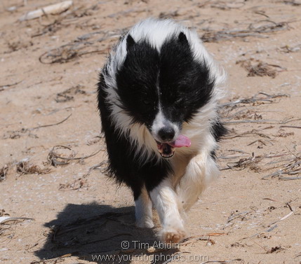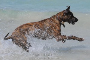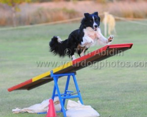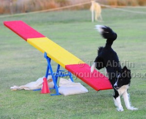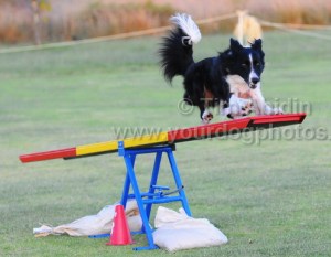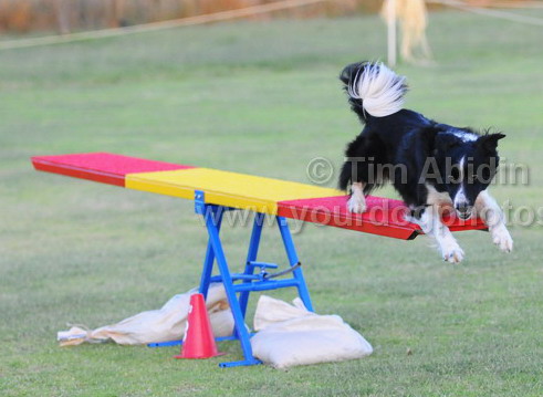 Tim was there taking photos with the new Nikon D300. I really like the speed of this camera, it can take up to 8 frames per second. Below is a four shot sequence of a seesaw by one of the fastest dogs in the country. Domino obviously executes a two on two off seesaw (and is one of the only dogs either brave enough or kamikaze enough to have his front paws hanging off like this) and is trained and handled by Gina O’Keefe. He’s owned by Gina and Liz Alcock. I daresay his seesaw is around 0.5 to 0.7 from paw on to stop.