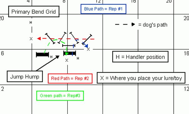 Rep 4,5 6 have dog bend round the other side three times. Again keep the dog on a cicle path with the placement of lure/toy. Handler always positioned on the inside. May take a step forward if dog cutting inside of uprights.