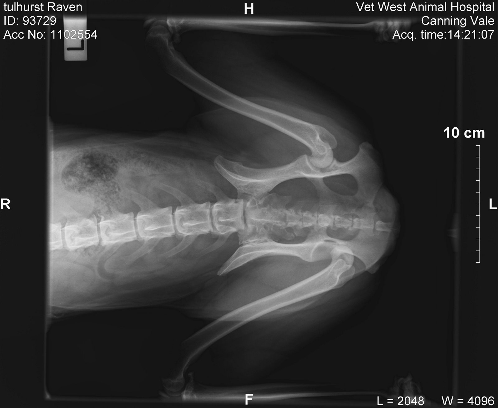 The vet suspected dislocated hip and wanted to do a GA asap in order to xray and replace it if indeed her suspicions were correct. Once a hip is dislocated the quicker it gets replaced the better and it’s virtually impossible after 12 hours. She explained what she would do and that she would strap it and that the strapping would be on for 10 to 14 days etc. She topped up Raven’s Rimadyl dose with an injection and then gave an injection of Temgesic (Sp?) which is a more powerful painkiller drug.