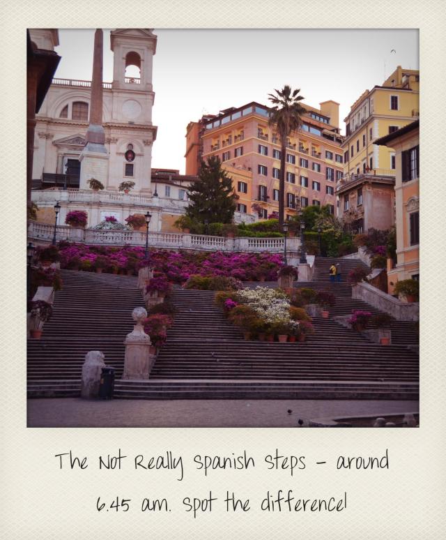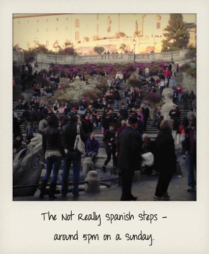 After refueling and helping to fill the rumbling gap in our stomachs we felt a little more invigorated so we took in The Spanish Steps. Which turn out not to be Spanish Steps at all. Apparently the French are really pissed off with this name as it was actually designed and built by a Frenchman. They lead up to and pay homage to the church up the top. Of course they sit on the Piazza Di Spagna – so named because the Spanish Embassy to the Holy See is there. And once that was there according to the church it was only right that everything became “Spanish”, hence the name Spanish Steps. Shockingly the church is responsible for the malapropriation of a monument once again. We managed to (very cleverly and completely unintentionally) take two versions of these steps.