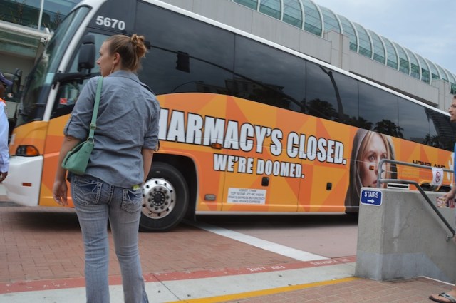 Even the transport round town gets in on the act. Buses wrapped in ads for TV shows and Movies.