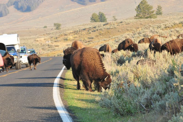 Tuesday afternoon we took a drive into Lamar Valley as we’d heard the wolves were frequenting the area and as the sun goes down this is a good spot. First encounters with the Bison happened here!